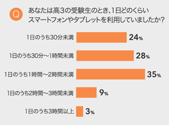 受験生の時のスマートフォンやタブレット使用時間は、1日のうち1時間~2時間未満が最も多く、全体の35%。受験生ともなると2時間以上費やしている人は少なく、約9割がスマホの利用を1日2時間未満に収めていたようです。