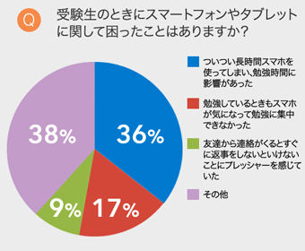 アンケートによると、長時間スマホを使ってしまい勉強時間に影響が出てしまった人や、スマホが気になって勉強に集中できなかった人は全体の約半数。用がなくてもつい手が伸びてしまい、気分転換では収まらなくなってしまうのかもしれません。「上手に使わないと受験勉強に影響がある」と回答した人は、実に96%にも上りました。