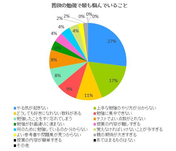 勉強で悩んでいることについて、現役の中学生、高校生にアンケートを行ったところ、悩みでもっとも多かったのは、27%で「やる気が起きない」でした。