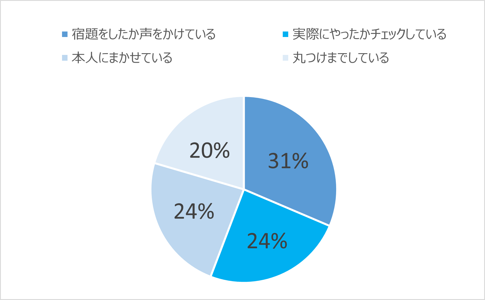本人に任せているという回答は全体の24%にとどまり、小学生のお子さまの宿題については何かしらのサポートをされているかたが多いようです。