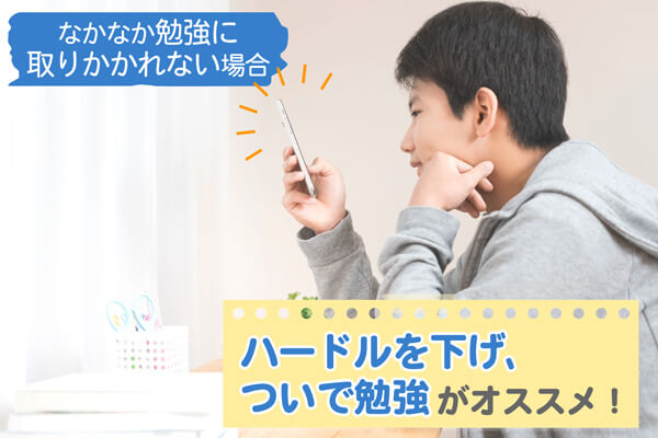 勉強に取りかかるには、簡単でサクサク終わる内容から始めることがポイント。5分程度で終わるドリルや、あまり考えなくていい音読などで、勉強へのハードルを下げましょう。いいウォーミングアップとなり、勉強へのエンジンがかかるはずです。