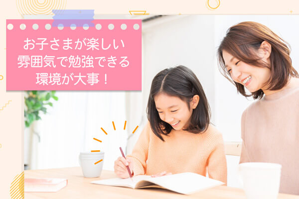 勉強の効率は、お子さま自身の意欲がカギを握ります。保護者のかたは、「楽しい雰囲気で子どもが勉強ができる」お膳立てをするスタンスでいられるといいですね。