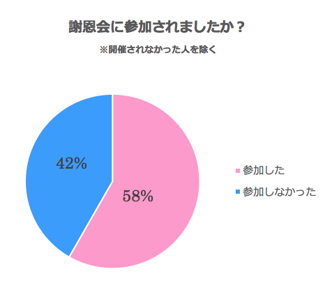 「開催された」という回答が、半数を下回る結果になりました。「準備するのが大変」といった理由から、年々開催する小学校は減っているようです。実際に「謝恩会の準備などをPTA役員が負担に感じるならば、無理に継続する必要はないと思う」という声も寄せられました。また、謝恩会が開催されたという場合でも、自由参加の場合が多く、実際に参加したかたは、そのうちの約6割という結果になりました。