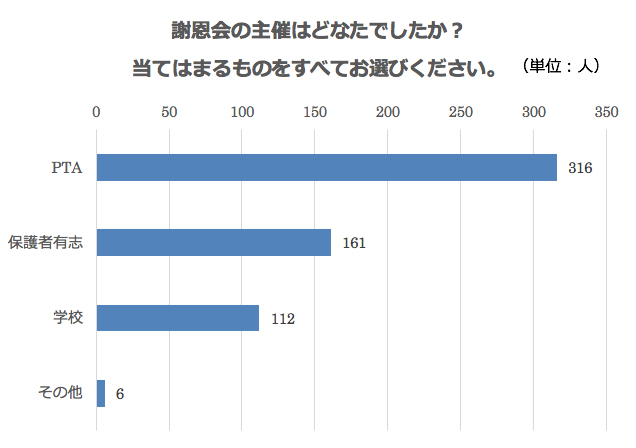 また、先生に感謝を伝えるための謝恩会ですが、PTAや学校が主催ではない場合は、先生が参加できない場合もあるようです。実際に「学校によって先生は参加できないことがあるので、よく相談したほうがよい」「少し前と違い、先生は参加しないことが多くなっている」といった声が寄せられました。有志で実施する場合は、先生にご参加いただけるかを事前に確認してから、企画内容を考えると良いですね。