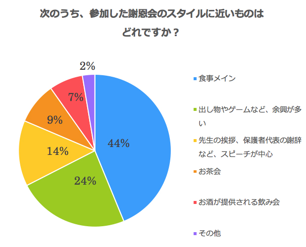 多くの小学校では、PTA主催で行われているようです。参加費用は5,000円以下が半数以上という結果になりました。企画内容としては、食事中心のところが多く、その他余興や先生や保護者からのスピーチを実施する謝恩会も多いようです。