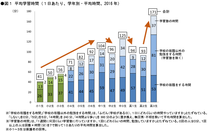 ●学習時間の平均は、小1生から中1生まで堅調に増加するものの、中1生から中2生にかけて8分減少する。同様に、中3生から高1生にかけては31分減少する。【図1】