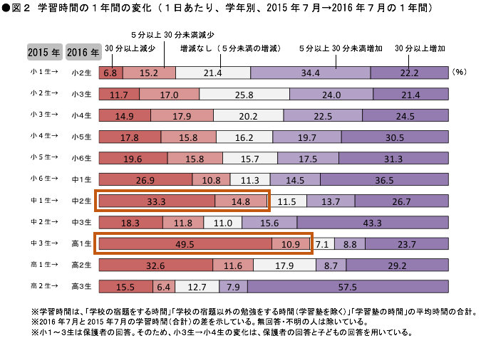 ●同じ子どもの変化を1年間追跡した結果では、中2生の約半数、高1生の6割が前年よりも学習時間を減らした。中だるみや学習ばなれが起きやすい学年であることがわかる。【図2】