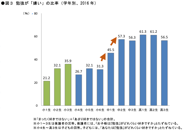 ●勉強が「嫌い」(「まったく+あまり好きではない」、以下同様)は、小1~6生では2~3割にとどまる。しかし、小6生から中2生にかけて26.0ポイントも増加し、中2生で約6割に達する。【図3】