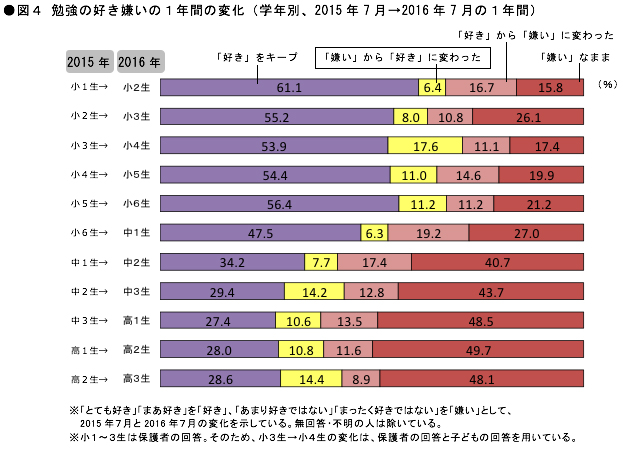 今回は、2015年と2016年の2時点における調査から、12学年にわたる学習の実態や変化を明らかにしました。主に、学習意欲(勉強の好き嫌い)に注目し、勉強が好きになった子にはどのような特徴があるのかを検討しています。