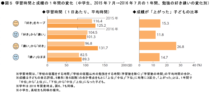 ●勉強が「嫌い→好き」になった子どもは、他の子どもに比べて前年よりも学習時間を増やしている(35分増加)。また、成績が上がったのは26.8%で、他の子どもよりもその比率は高い。【図5】
