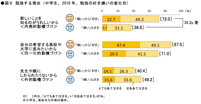 ●勉強が「嫌い→好き」になった子どもは、「新しいことを知るのがうれしい」という内発的な学習動機をもって勉強している比率が高い(35.2ポイント差)。【図6】