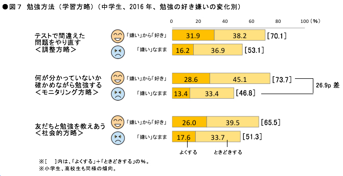 一方で、1年間の追跡調査の結果からは、勉強が「嫌い」な子どもが増える中学生以降にも、「勉強が 好きになった子」が1割程度いることがわかりました。こうした子どもの特徴を分析することで、勉強が好きになるためにはどうしたらよいかを考える手がかりが得られます。この子たちの多くは、「新しいことを知るのがうれしい」(内発的動機づけ)、「自分の希望する高校や大学に進みたい」(同一化的動機づけ)といった高い学習意欲をもち、さまざまな学習方法を工夫しています。また、追跡した1年の間に学習時間を増やしたり、成績が上がったりした比率が相対的に高いのも特徴です。学習動機をもち、一定の学習時間を確保し、効果的な学習方法を身につけていくことが、「勉強好きな子ども」を育てるうえでとても大切なことがわかります。