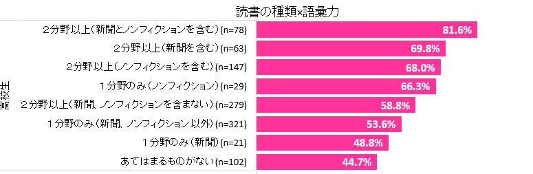 ただ、ノンフィクションや新聞だけを読んでいれば語彙力は向上するのかというと、そうではないようです。読む本や文章の種類によってグルーピングした結果では、「新聞、ノンフィクションを含む複数分野」を読む人の語彙力が最も高く、幅広いジャンルの読書をする人のほうが、語彙がより高い傾向にあることがわかります。