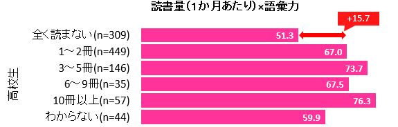 では「内容」の次に読書の「量」についてはどうでしょうか。具体的な読書量と語彙力の関係についての調査を見てみると(図2:高校生の結果)、「1か月に1~2冊」読むと答えた人の語彙力が67.0%だったのに対して、「まったく読まない」と答えた人は51.3%で、およそ15.7ポイントの開きがあることがわかりました。少しの量でも読書をしたほうが語彙力の向上につながる可能性が高いということがわかります。