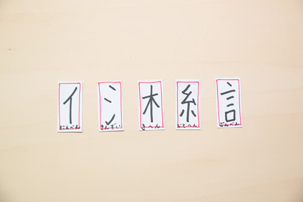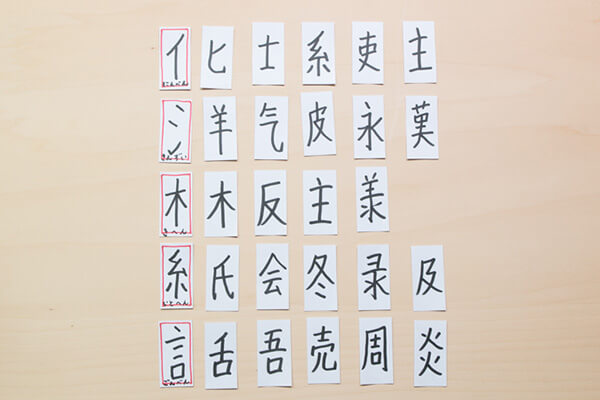 1. 画用紙を3cm×6cmに切り抜いたものを、30枚ほど作り、カードを制作します。今回は、3年生までに習う漢字を対象にしてみました。対象とする漢字の中から、5つの「へん」を選び、カードに書きます。(各学年で習う漢字は、教科書・漢字辞典・漢和辞典で確認できます)。「へん」の下には「きへん」「にんべん」などの「へん」の名称を書きます。「へん」以外のカードと見分けやすくするため、「へん」のカードはカラーペンで囲いましょう。これで「『へん』カード」の出来上がりです。
