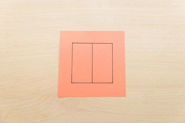 3. 「カード置き場」を作ります。10cm四方くらいの大きさに切り取った、色紙や折り紙に(ない場合は画用紙でも大丈夫です)写真のように6cm四方の正方形を描き、中心に線を引きます。左が「『へん』カード」を置くスペース、右が「へん」に対応する「右側のパーツ」を置くスペースです。