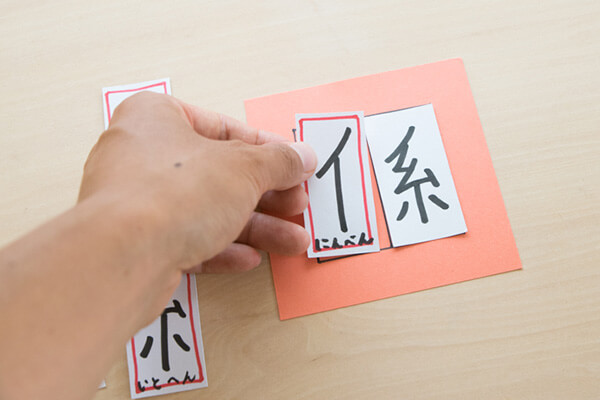 2. それぞれの「へん」に対応する「右側のパーツ」を教科書などで調べてカードに書きます。まずは5つ選んでカードにしてみましょう。