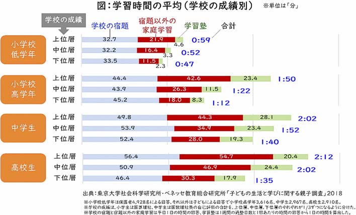 では、「自ら学ぶ力」を身につけるには、どうしたらいいのでしょうか。コントロールすべき要素は、学習の「量」と「質」です。このうち、わかりやすいのは、一定量の学習ができているかということ。図は学習時間の平均を学校の成績別に示しています。「学校の宿題」の時間は成績による差がありませんが、成績上位の子どもほど「宿題以外の家庭学習」の時間が長い傾向があります。学習成果を上げるにも、自ら学ぶ力を身につけるにも、自分で勉強しないことには始まりません。まずは、学習習慣の定着を目標にしてみてください。