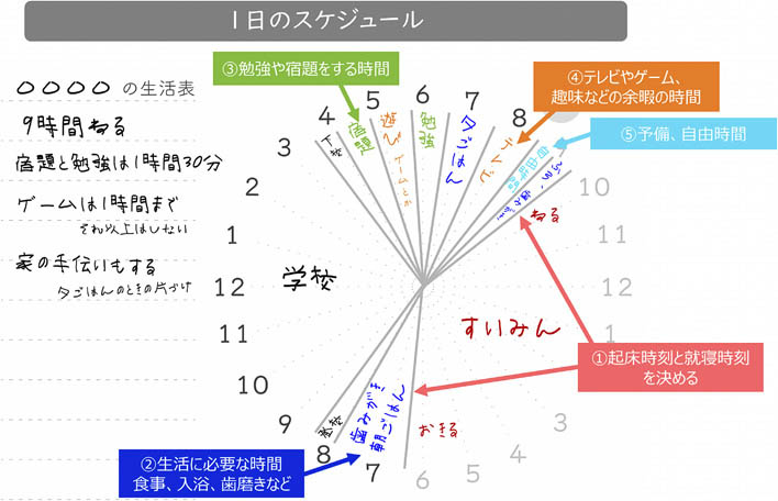 一定量の学習ができていなかったり、学習習慣が崩れてしまったりしている場合は、1日のタイムスケジュールを決めましょう。例えば下のような予定表を作り、まずは寝る時間と起きる時間を決めて書き込みます。そして、食事や入浴、学校や習い事といった動かせない予定を入れます。すると、空いている時間が“可視化”されるので、そこに勉強や遊びなどを入れていきます。