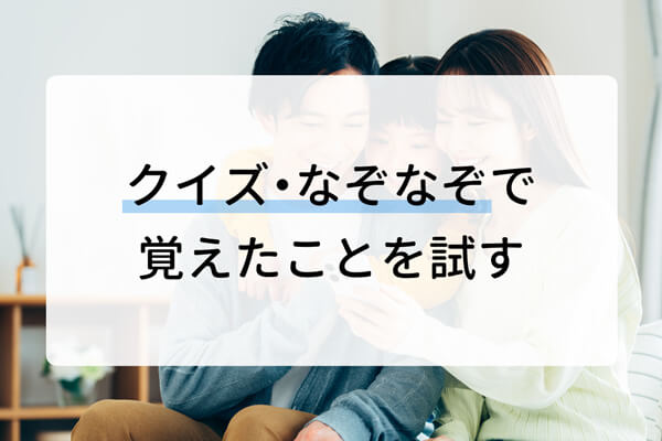 都道府県の暗記に限らず、知識の定着にはアウトプットする機会をつくることが大事です。ただ都道府県に関する問題を解くだけでなく、「山の漢字を使う県は?」「動物の漢字が含まれる県は?」というようなクイズやなぞなぞも、楽しみながら暗記したことをアウトプットできるためおすすめです。