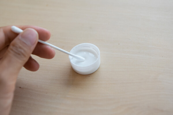 1. ペットボトルのキャップ等を容器にしてボンドを入れ、ここから綿棒に塗布できるようにします。