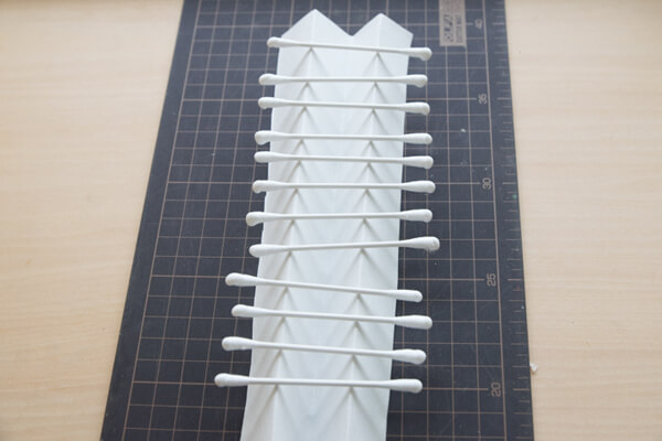 2. まず12本の綿棒の両側にボンドを付け、30分程乾かします。この綿棒で、中心になる「正八面体」を作ります。ボンドが下に付かないよう、乾燥中の綿棒は蛇腹状に折った紙の上に並べましょう。写真のものは、25×10cmにカットした紙を使用しています。