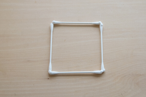 3. 「2」で乾燥させた綿棒から4本取り、角の接着させたい部分をくっつけるようにして、正方形になるように並べます。