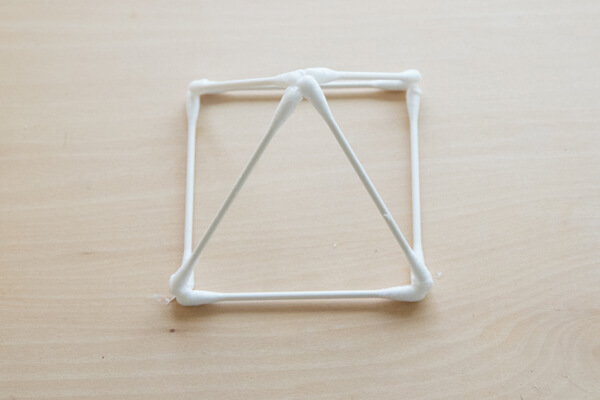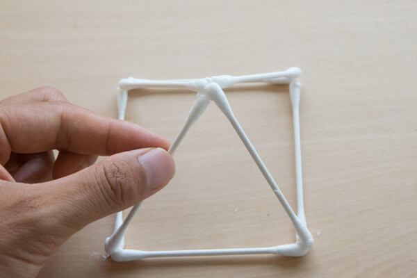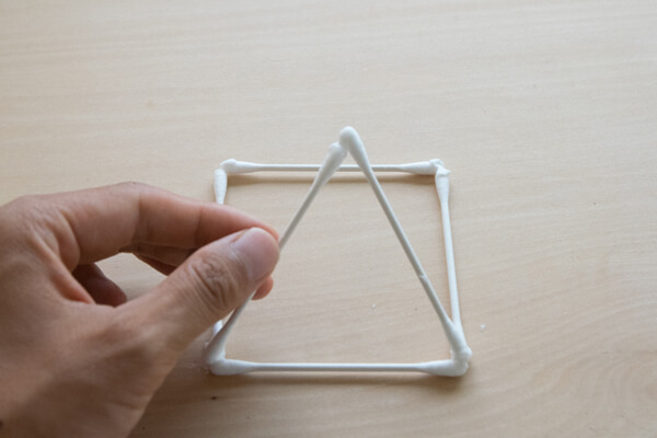 5. 正方形の奥の2つの頂点にも綿棒を一本ずつ接着し、「4」の三角形の頂点に寄り掛からせます。