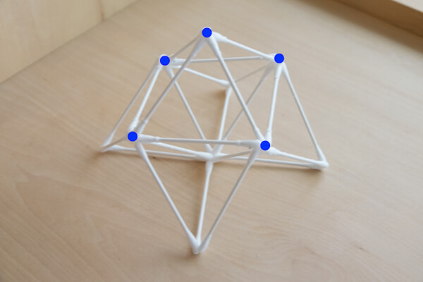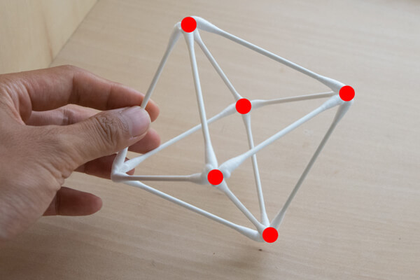 9.持ち上げても正八面体が崩れないようになったら、赤で示した5つの頂点を起点に、4つの三角錐を作っていきます。