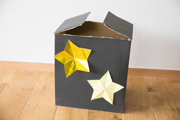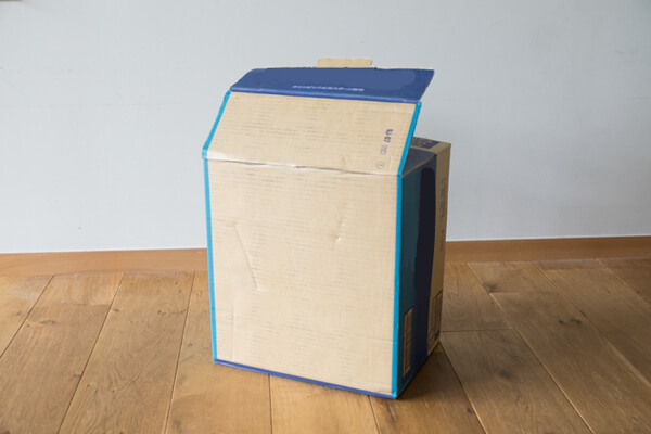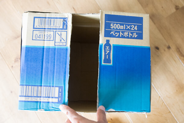 17.さて、次は「星型八面体」を入れる「ミニ暗室」を作りましょう。角辺が20cm以上ある箱を用意します。今回は、500mlのペットボトルが24本入っていた段ボールを使用しました。写真のように開け口を下にして置き、高さが30cmになるように折り曲げます。