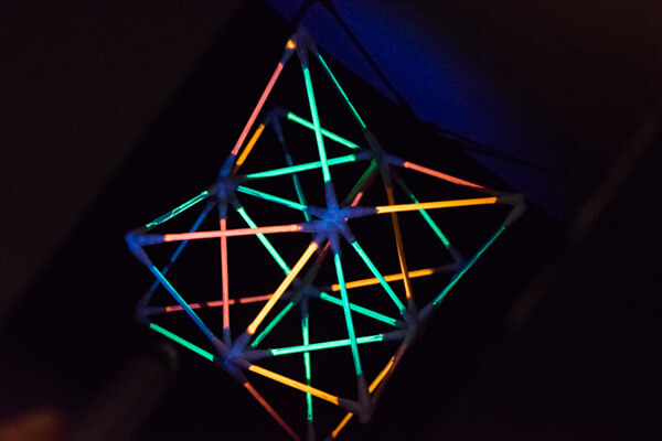1.「星型八面体」を「ミニ暗室」に入れます。暗室上部の穴から、ブラックライトを差し込み、照らしてみると……。