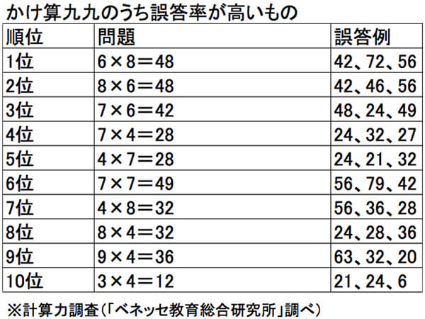 以下の表は、かけ算九九の中で誤答が多かった問題と誤答例を挙げたもの。6・7・8の段が多く含まれていることがわかるでしょう。