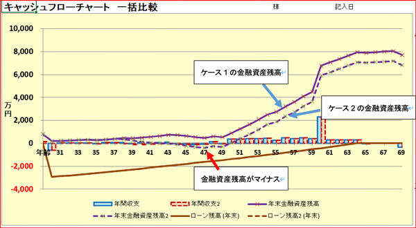 以下のグラフは、ケース1とケース2の金融資産残高、年間収支、ローン残高を比較したものです。