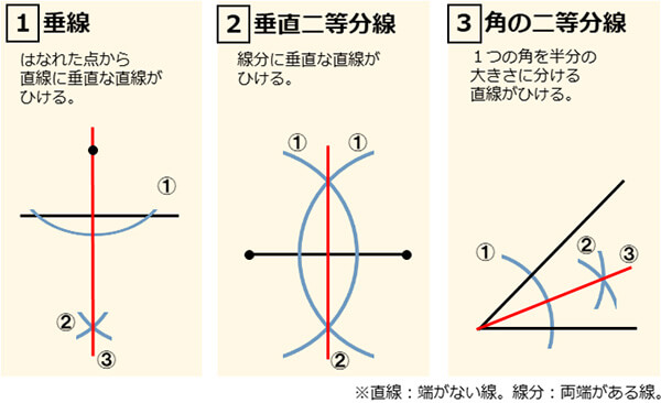 「作図をしなさい」という問題では、定規とコンパスだけを使って図をかくことを指示されています。中学校の数学で習う作図は以下の3つ。