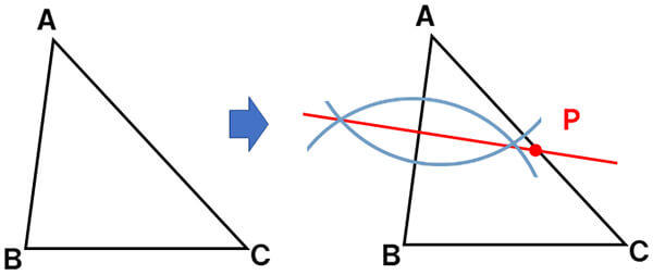 2020年の東京都入試では、「三角形ABCにおいて、辺AC上にあって、AP=BPとなる点Pを作図する」という問題でした。この問題では、AP=BPの部分に注目します。点Aからも点Bからも等しい点は、点A、Bそれぞれから等しい半径の円をコンパスでかくことで求められるので、基本の作図の2垂直二等分線を使います。垂直二等分線でかいた直線上にある点は、線分の両端である点A、Bからの距離が等しいので、その直線と辺ACが交わる点が求める点Pとなります。
