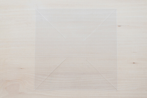 2.「1」の頂点の角と角を結んで、千枚通しの先等で「×」を書く。(油性ペン等でもOKですが、こうすると跡が目立ちません)「×」の端から8cmに、それぞれハサミで切り込みを入れる。
