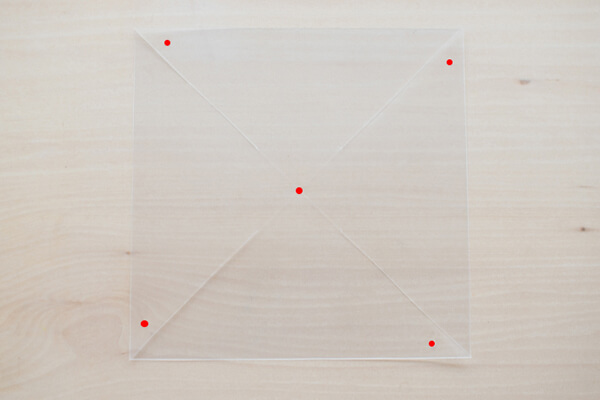 3.「×」の中心と、4つの角に(赤い点の部分)、それぞれ千枚通し等で穴を開ける。