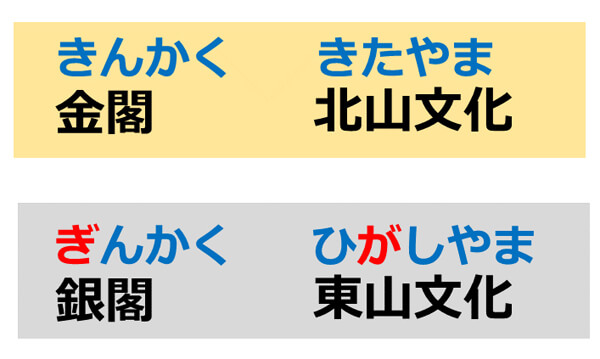 たとえば「金閣(鹿苑寺)」と「銀閣(慈照寺)」は、それぞれ室町時代の北山文化と東山文化の代表例です。テストでは「金閣‐北山文化」「銀閣‐東山文化」の組み合わせがよく問われるのですが、【金】と【銀】、【北】と【東】を取り違えることが多いです。しかし【用語に含まれる文字そのもの】に注目すると、確実に見分けることができます。ではここで突然クイズです。