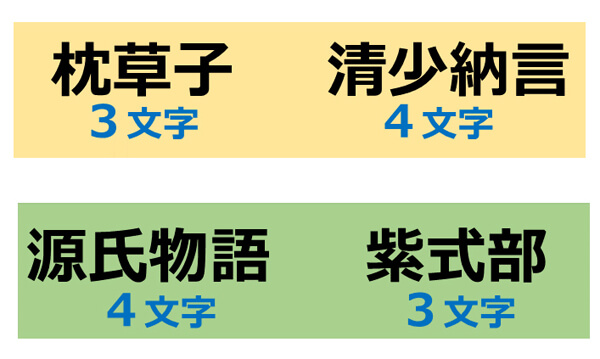 漢字で書くと『枕草子』は【3文字】、「清少納言」は【4文字】です。逆に『源氏物語』は【4文字】で、「紫式部」は【3文字】です。つまり「作品名と作者は、同じ文字数ではない」という関係がみえてきます。