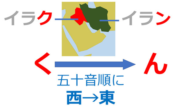 次に「イラン」が東で、「イラク」が西なので、地図上に並べると「左がイラ【ク】」「右がイラ【ン】」になります。