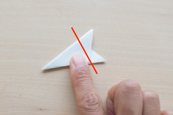 4. あまった部分(残りの1/3)を後ろに折ります。赤線のところでカットしましょう。