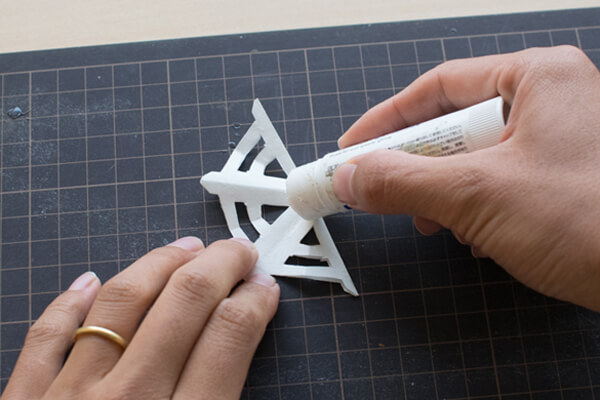 17.結晶を1枚半分に折り、半面にのりを塗ります。破れないよう丁寧に塗りましょう。