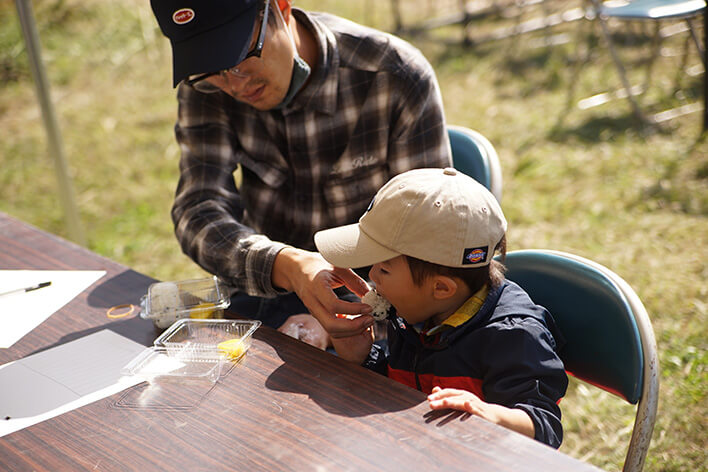 作業が終わった後は、田んぼの風景を眺めながら達成感を味わい、前もって収穫された新米のおにぎりを食べ、今日の作業を労います。皆の手で収穫したお米がご飯になる過程も実感することができました。