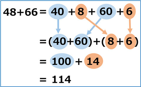 これは、48や66を「キリのいい数」を使って分けたあと、たし算の順番はかえてもいいということを利用しています。2桁同士の計算ですが、1桁同士の計算のように解くことができますね。