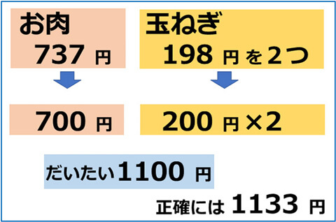 計算しやすいように十の位を四捨五入しましょう。すると、737円のお肉はだいたい700円、198円はだいたい200円ですから玉ねぎは2つでだいたい400円ですね。したがって、700円+400円で、だいたい1100円だとわかります。