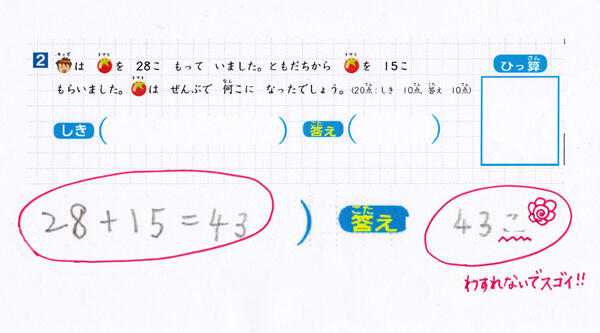 まちがえている場合でも、計算のメモや消し跡から一生懸命考えたことがわかれば、そこに花丸をつけてほめてあげましょう。考えた行為そのものを認めることが、お子さまの「考える意欲」を育てることにつながります。