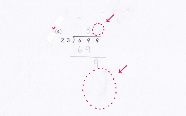 お子さまがすぐに解き直せるように、まちがえた答えの「どこが」ちがっているのかをわかりやすく示してあげるとよいでしょう。点線で囲み、矢印で指す。これだけでOKです。