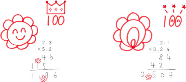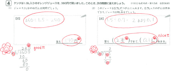 子どもがミスをしがちな、算数の「単位」や「小数点」、漢字の「とめ・はね」「出る・出ない」などができていたり、きちんと計算したあとがみられたりするときなどは、その箇所にミニ花丸をつけてほめます。「good!!」などの一言があるとより効果的です。特に、ローマ字や英語を習う学齢では、かっこよくほめてもらえた気がして嬉しいようです。子どもは、細かいところまでみてくれたことを喜び、これからも実行しようという気持ちになります。よい習慣を続けることで、「ここはできる!」「これは得意!」という自信も芽生えます。