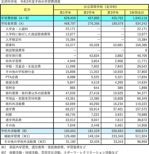 高校に入学してからの費用はどれくらいかかるのでしょうか。文部科学省が公表している「子供の学習費調査(2021年)」によると、公立高校3年間の学習費総額は約154万円です。次に学校教育費について学年別で確認してみると、入学時に必要な制服や通学用品などを揃えなければならない高校1年生が約63万円と、最も負担の大きな学年となっていました。