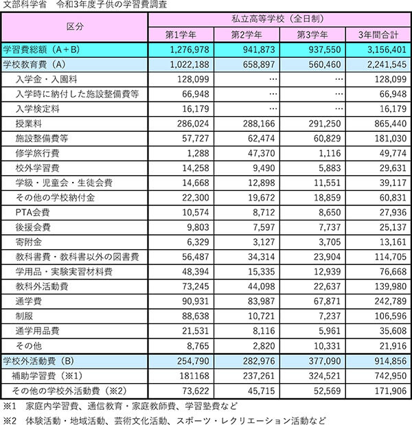 ここからは「子供の学習費調査(2021年)」より、私立学校でかかるお金について確認してみたいと思います。同調査結果によると、私立高校の学習費総額は、3年間で約316万円です。つまり公立高校の2倍以上かかるということです。